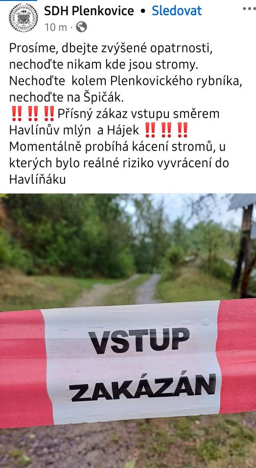Vážení občané, z důvodu nebezpečí pádu stromů Vás žádáme, nechoďte kolem plenkovických rybníků, do lesů a do lokalit ve kterých se nacházejí stromy. V současné době probíhá kácení nebezpečných stromů. Děkujeme za pochopení.