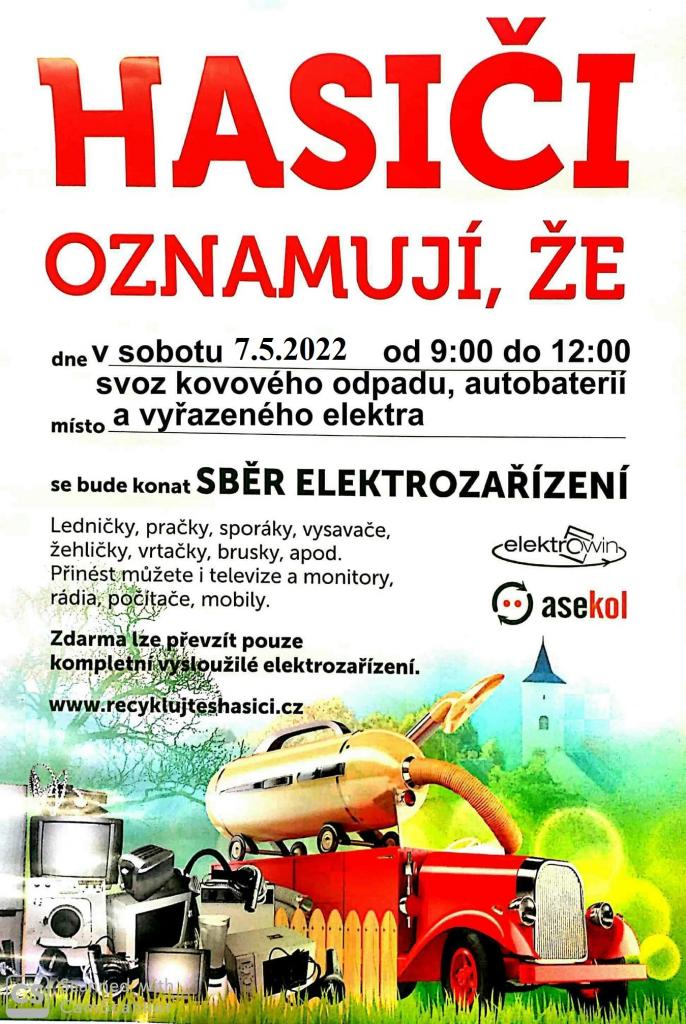 SDH Plenkovice bude provádět svoz kovového odpadu, autobaterií a vyřazeného elektra 7.5.2022.
