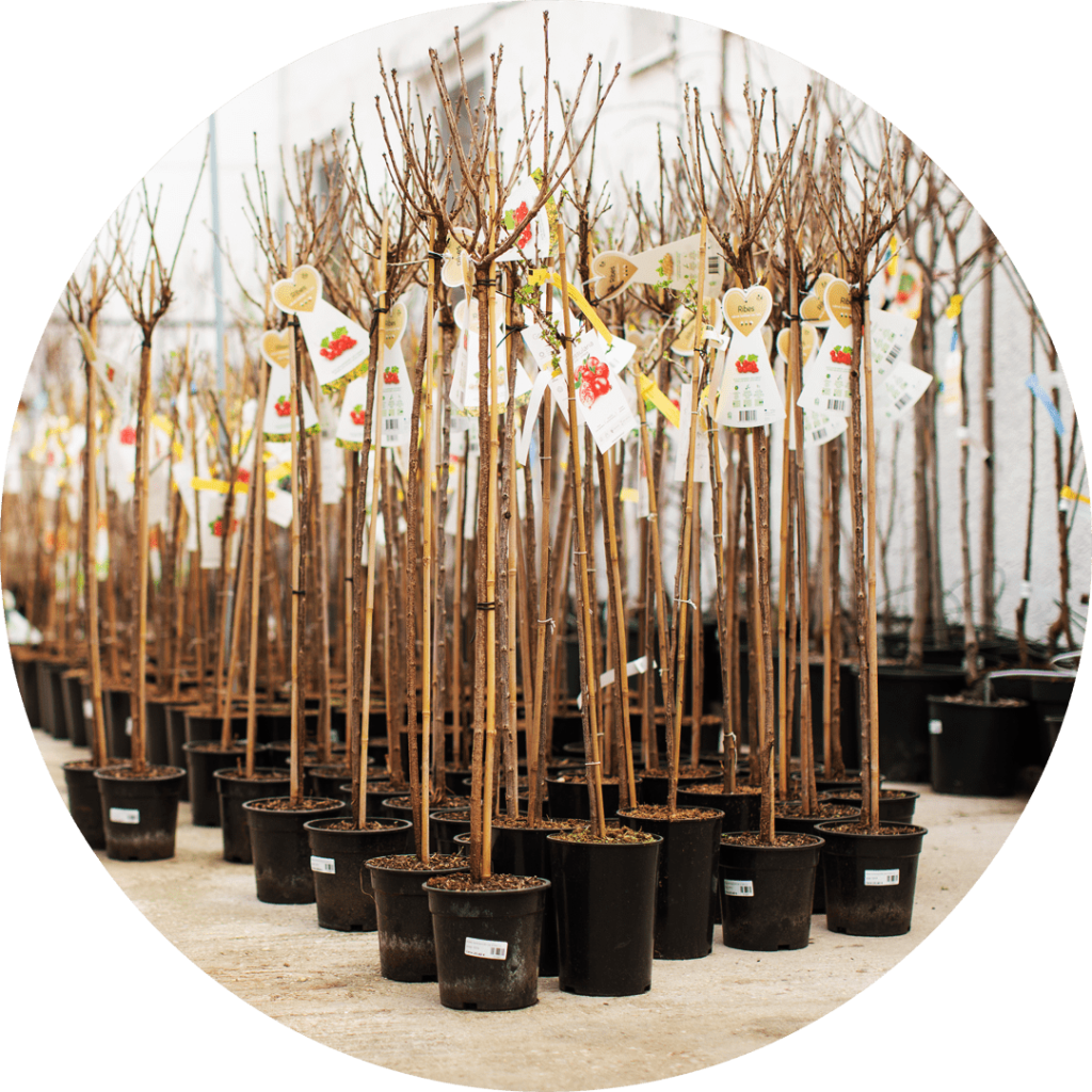 Jabloně, hrušně, asijská hrušeň, třešeň, višeň, meruňky, švestky, muruňko-švestky, ryngle, broskve, vlašský ořech. Sloupové jabloně. Angrešt, rybíz, maliny, ostružiny.Rakytník řešetlákový (včetně samců), Muchovník (indiánská borůvka), Goji (Kustovnice čínská). Růže velkokvěté velký výběr.