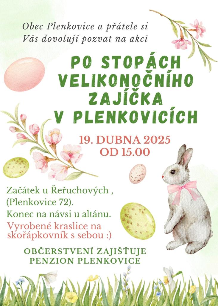 3. Obec Plenkovice a přátelé Vás zvou na akci :Po stopách Velikonočního zajíčka, která se uskuteční v sobotu 19.4.2025 od 15 hod.