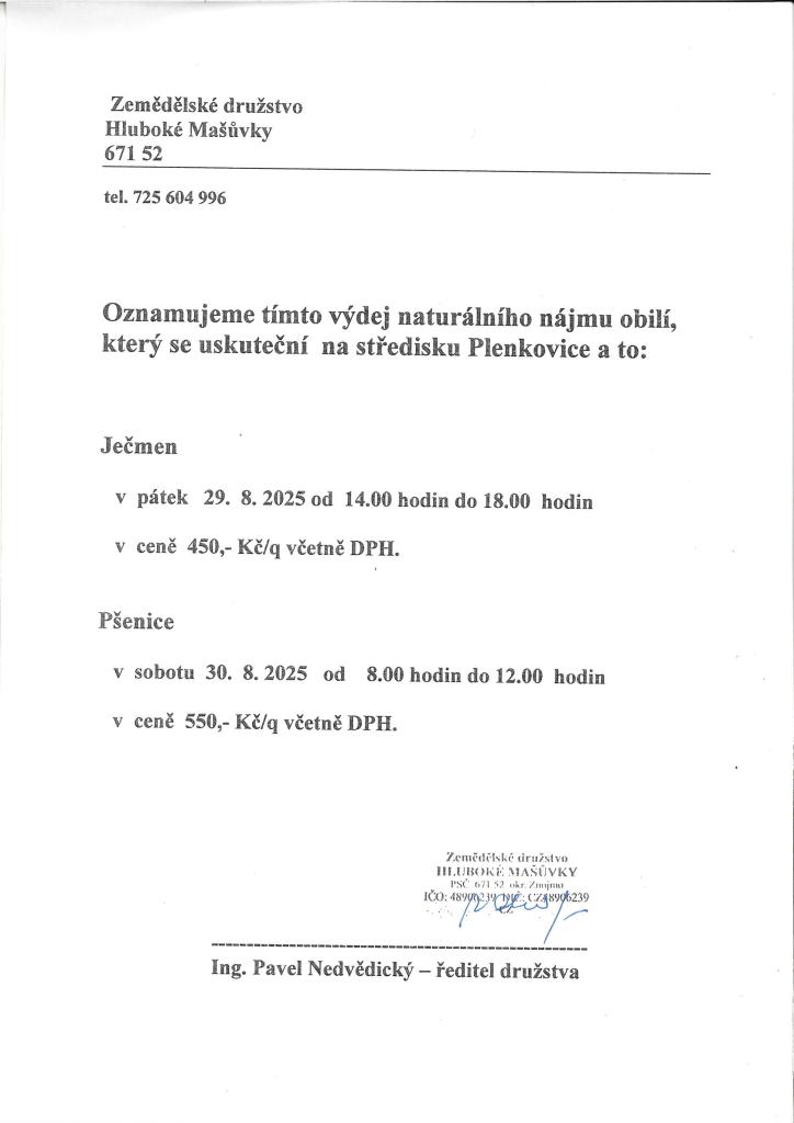 Naturální nájem obilí ZD Hluboké Mašůvky